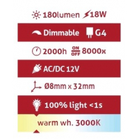 Τεχνικές λεπτομέρειες Υποδοχή G4 Ισχύς 18 W Ισοδύναμη ισχύς 24 W Περιοχή τάσης DC12 V Θερμοκρασία λειτουργίας -20 - +40 ° C IP τάξη IP20 Οδηγός N / A Διάμετρος 8 mm Ύψος 32 mm